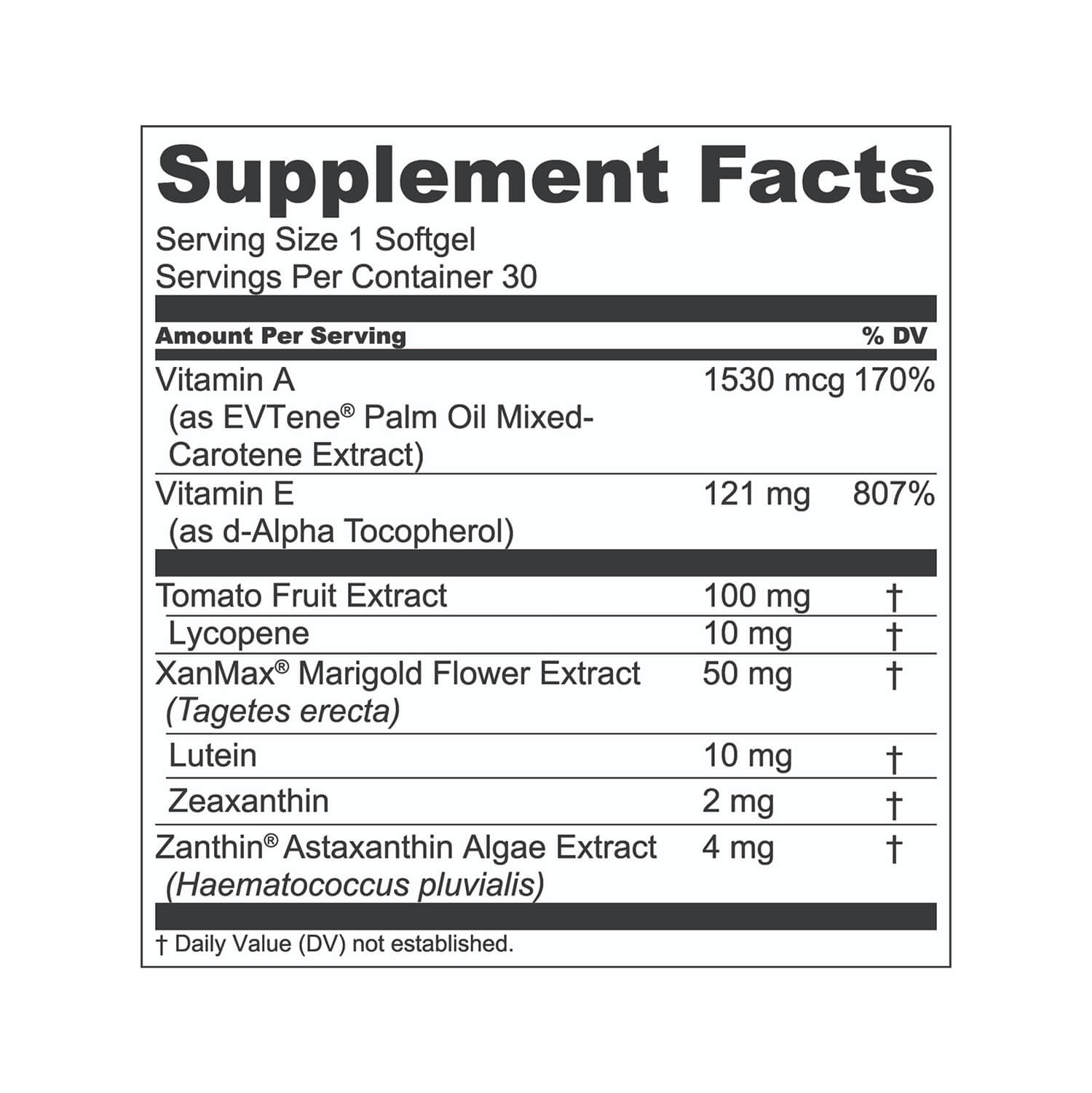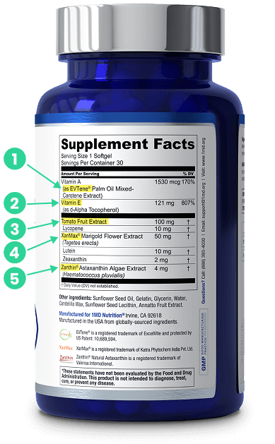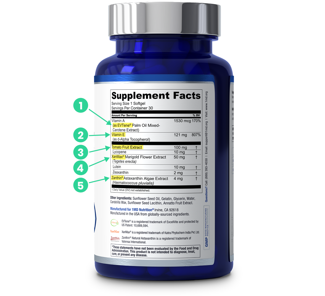 Astaxanthin crosses the blood-retinal barrier to reinforce retinal stem cells—so your eyes can repair themselves naturally. Clinical lutein and zeaxanthin build macular pigment. Vitamin E, A, and lycopene replenish what screens deplete. Every ingredient at clinically effective doses.